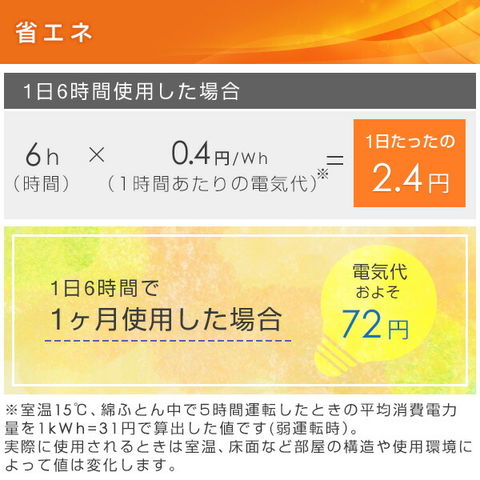 | 商品説明 | ●消費電力:40W ●表面温度:(弱)約23度、(適温)約33度、(強)約40度 ●1時間あたりの電気代目安:(強)約1.2円・(適温)約0.8円・(弱)約0.2円 ※電気量目安単価31円/kWh(税込)として算出 ●ダニ対策機能 ●本体丸洗い可能 ※コントローラーは洗えません ※こちらの商品は2022年8月に型番変更をしております 【変更点】型番:YBK-M1412→YBK-M1413 |
