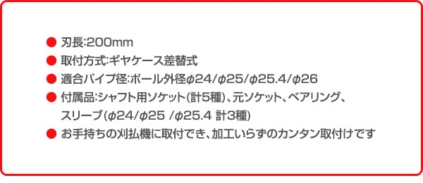 | 商品説明 | ●刃長:200mm ●取付方式:ギヤケース差替式 ●適合パイプ径:ポール外径φ24/φ25/φ25.4/φ26 ●付属品:シャフト用ソケット(計5種)、元ソケット、ベアリング、スリーブ(φ24/φ25 /φ25.4 計3種) ●飛散、跳ね返りを抑える上下刃往復方式 ●チップソーでは危険な場所でも、安全にお使いいただけます ●角度固定式とすることで従来の角度可変式に比べ25%軽量化 ●徹底した疲労軽減と取り回しの良さを実現しました ●従来品と比較して刃の角度を変更する事で切断抵抗を少なくし、ギヤ比を変更する事で約2割動作速度を向上させています ●刃は耐久性に優れた高級刃物鋼、ヤニサビに強い無電解ニッケルメッキ仕上げ、そして刃先三面研摩処理でシャープな切れ味を実現しました ●お手持ちの刈払機に取付でき、加工いらずのカンタン取付けです |
