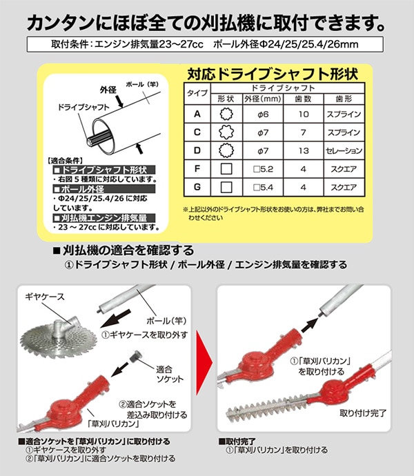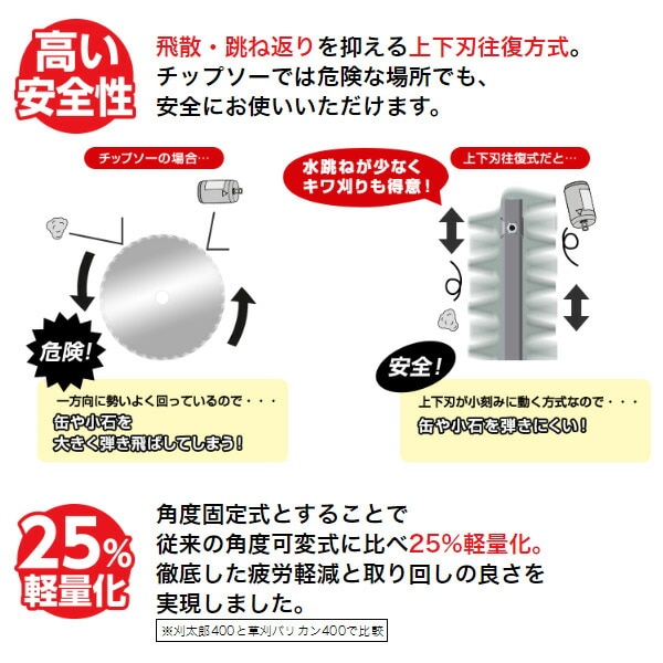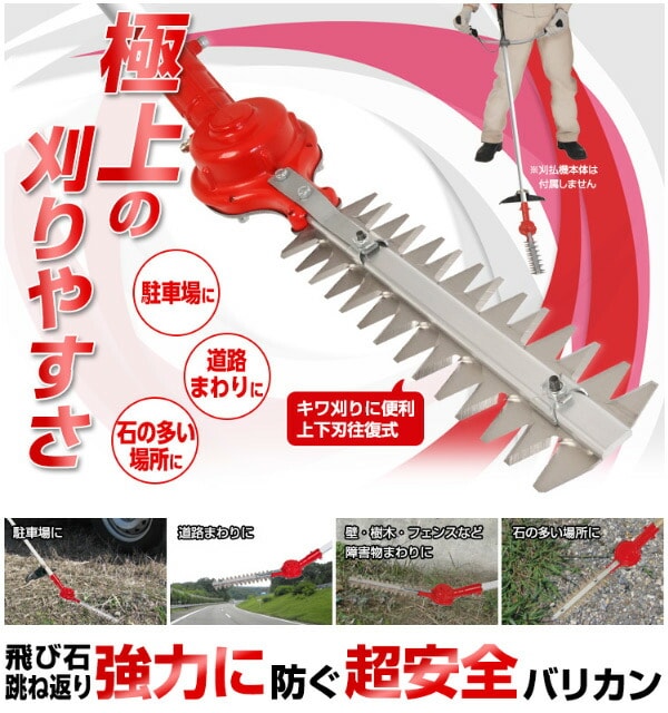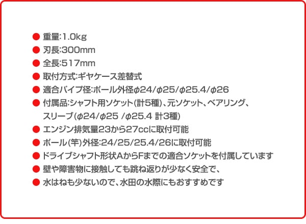 | 商品説明 | ●重量:1.0kg ●刃長:300mm ●全長:517mm ●取付方式:ギヤケース差替式 ●適合パイプ径:ポール外径φ24/φ25/φ25.4/φ26 ●付属品:シャフト用ソケット(計5種)、元ソケット、ベアリング、スリーブ(φ24/φ25 /φ25.4 計3種) ●エンジン排気量23から27ccに取付可能 ●ポール(竿)外径:24/25/25.4/26に取付可能 ●ドライブシャフト形状AからFまでの適合ソケットを付属しています ●刃は高級刃物鋼を使用し、切れ味の良い3面研磨処理を施しています ●無電解ニッケルメッキ仕上げによりヤニやサビに強い刃になっています ●従来品と比較して刃の角度を変更する事で切断抵抗を少なくし、ギヤ比を変更する事で、約2割動作速度を向上させています ●上下往復式により、飛散事故を大幅に軽減 ●壁や障害物に接触しても跳ね返りが少なく安全で、水はねも少ないので、水田の水際にもおすすめです ●角度固定式とすることで 従来の角度可変式に比べ25%軽量化を実現 疲労軽減、取り回しの良さを実現女性やご年配の方にもおすすめします |