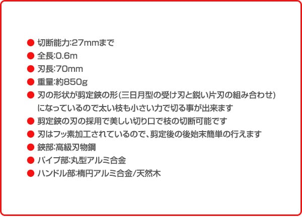 | 商品説明 | ●切断能力:27mmまで ●全長:0.6m ●刃長:70mm ●重量:約850g ●使いやすさと最高の切断力 ●従来の高枝切りハサミでは困難だった太枝切りを、両手を使ったテコの原理で実現、軽量アルミパイプや手触りの良い木柄など材質はもちろんの事、機能にもこだわり、多くの方に安心してお使いいただける一品となっています ●テコの力でらくらく枝切り出来ます ●刃の形状が剪定鋏の形(三日月型の受け刃と鋭い片刃の組み合わせ)になっているので太い枝も小さい力で切る事が出来ます ●鋏が首の所で112度回転することが出来るので、狭い所での作業性に優れています ●剪定鋏の刃の採用で美しい切り口で枝の切断可能です ●木の腐りや病害虫の侵入を防ぎます ●植木の根切りにも使用できます ●刃はフッ素加工されているので、剪定後の後始末簡単の行えます ●鋏部:高級刃物鋼 ●パイプ部:丸型アルミ合金 ●ハンドル部:楕円アルミ合金/天然木 |