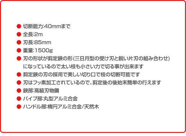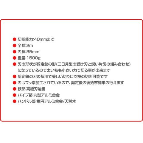 | 商品説明 | ●切断能力:40mmまで ●全長:2m ●刃長:85mm ●重量:1500g ●使いやすさと最高の切断力 ●従来の高枝切りハサミでは困難だった太枝切りを、両手を使ったテコの原理で実現、軽量アルミパイプや手触りの良い木柄など材質はもちろんの事、機能にもこだわり、多くの方に安心してお使いいただける一品となっています ●テコの力でらくらく枝切り出来ます ●刃の形状が剪定鋏の形(三日月型の受け刃と鋭い片刃の組み合わせ)になっているので太い枝も小さい力で切る事が出来ます ●鋏が首の所で112度回転することが出来るので、狭い所での作業性に優れています ●剪定鋏の刃の採用で美しい切り口で枝の切断可能です ●木の腐りや病害虫の侵入を防ぎます ●植木の根切りにも使用できます ●刃はフッ素加工されているので、剪定後の後始末簡単の行えます ●鋏部:高級刃物鋼 ●パイプ部:丸型アルミ合金 ●ハンドル部:楕円アルミ合金/天然木 |