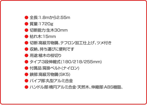 | 商品説明 | ●全長:1.8mから2.55m ●質量:1720g ●切断能力:生木30mm ●枯れ木:15mm ●切断:高級刃物鋼、テフロン加工仕上げ、ツメ付き ●刃は耐久性の高い高級刃物鋼を使用 ●刃の表面にテフロン加工を施す事で、樹液が付きにくく、滑らかな切れ味を実現しています ●刃の背はツメ形状にし、枝のカキ出しにご利用いただけます ●肩掛けベルト付属 ●肩掛けベルト付きで、より軽く使えます ●長い作業の疲労軽減に役立ちます ●ハンドルの止金具付き ●ハンドルの開閉を固定する止金具付き ●収納、持ち運びに便利です ●用途:植木の枝切り ●タイプ:3段伸縮式(180/218/255mm) ●付属品:肩掛ベルト ●鋏部:高級刃物鋼(SK5)、パイプ部:丸型アルミ合金 ●ハンドル部:楕円アルミ合金・天然木、伸縮部:ABS樹脂、肩掛ベルト:ナイロン |