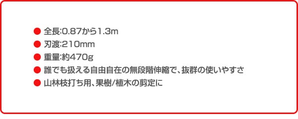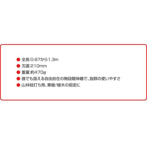 | 商品説明 | ●全長:0.87から1.3m ●刃渡:210mm ●重量:約470g ●誰でも扱える自由自在の無段階伸縮で、抜群の使いやすさ ●山林枝打ち用、果樹/植木の剪定に ●使い勝手の良い無段階伸縮により、剪定の自由度は抜群 ●伸縮操作もハンドルを回して緩めるだけの簡単操作 ●鋸刃やハンドルが細身で軽量なので、女性にも扱いやすい商品となっています ●超耐久、特殊刃先焼入の鋸刃 ●刃先は一瞬の衝撃加熱と冷却を行う特殊技術「ハード、インパルス加工」により、約3倍永切れする超耐久仕様になっています ●無電解ニッケルメッキを施す事で、ヤニやサビにも強い鋸刃となっています ●替刃式となっている為、いつでも新鮮な切れ味が得られます ●鋸刃角度4段階可変式 ●固定金具を操作する事で鋸刃角度を4段階に切り替えられます ●角度を変える事で無理な姿勢を防ぎ、スムーズな剪定作業を行えます ●安全、コンパクトな折りたたみ式 ●鋸刃を内側に折りたたむ事が出来ます ●大きく使って小さく収納、安全性にも優れた商品となっています |