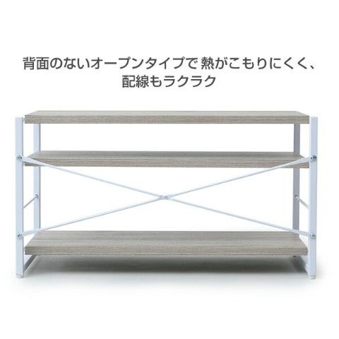| 商品説明 | ●お部屋に馴染むサテン塗装のフレームとヴィンテージトーンの木柄 ●対応目安:32型まで ●圧迫感がない、オープンタイプ ●棚は引っかけ式なので、高さ変更もラクラク ●棚板サイズ:幅80 奥行30cm ●床から下段棚内寸:高さ5.5cm ●棚間内寸:高さ10/22.5cm(2段階切り替え) ●耐荷重:棚板各20kg、全体耐荷重60kg |