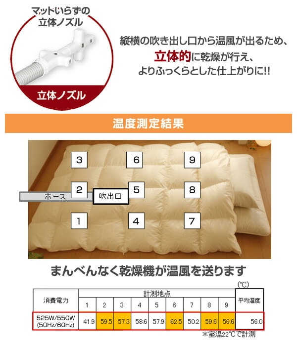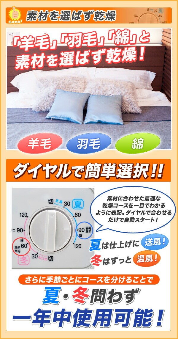 | 商品説明 | ●布団乾燥機と布団乾燥機用アタッチメント(カラッと!乾カシーナ)のお得なセット 【布団乾燥機】 ・電源:AC100V (50Hz/60Hz) ・消費電力(50Hz/60Hz):525W/550W ・電源コード長さ:1.8m ・付属品:布団乾燥アタッチメント(立体ノズル)、くつ乾燥アタッチメント ・タイマー:電動式タイマー120分 ・羽毛、羊毛対応 ・布団乾燥、靴乾燥が出来る ・たて置き、よこ置き対応 ・ダニ対策 ・コンパクト設計で収納しやすい!付属品はすべて本体に収納可能 ・夏コース・冬コース搭載 【乾カシーナ】 ・お手持ちの布団乾燥機につなぐだけ!温風でジメジメカーテンをカラッと乾かす ・結露で濡れたカーテンを乾燥させる、布団乾燥機用アタッチメント ※当製品で結露を完全に防ぐことはできません ・各社布団乾燥機に対応! ・接続カバー付き布団乾燥機吹き出し口対応サイズ:外周60cm以下 |