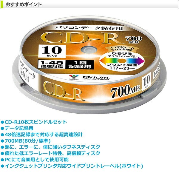 YAMAZEN ヤマゼン 山善 通販 CDR CD-R データ 書き込み 記録用メディア 再生 保存 10枚 スピンドル