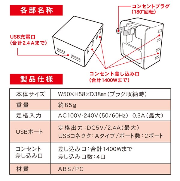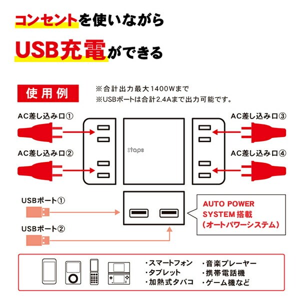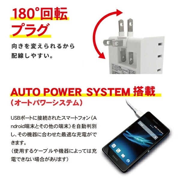 | 商品説明 | ●【コンセント差し込み口】 ●定格入力:AC100V-240V 50/60Hz 0.3A(最大) ●差し込み口:合計1400Wまで ●差し込み口数:4個口 【USBポート】 ●定格出力:DC5V 合計2.4A(最大) ●コネクタ形状:Aタイプ ●ポート数:2個口 ●オートパワーシステム搭載 ※USBポートに接続されたスマートフォン(Android端末とその他の端末)を自動判別し、その機器に合わせた最適な充電ができます ●180度回転プラグ。配線しやすい ●メーカー保証:1年 |