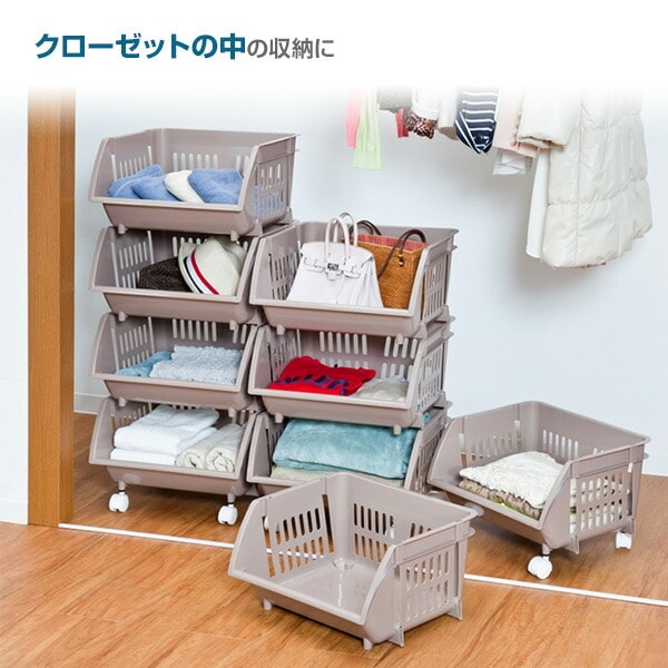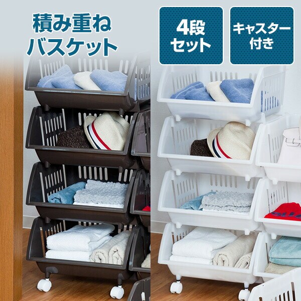 積み重ね バスケット キャスター付き 4段 日本製 積み重ねバスケット キャスター付き 4段 4個組 収納ケース かご ランドリー キッチン 平和工業 【送料無料】
