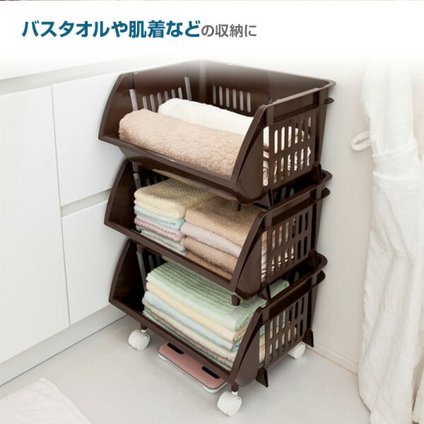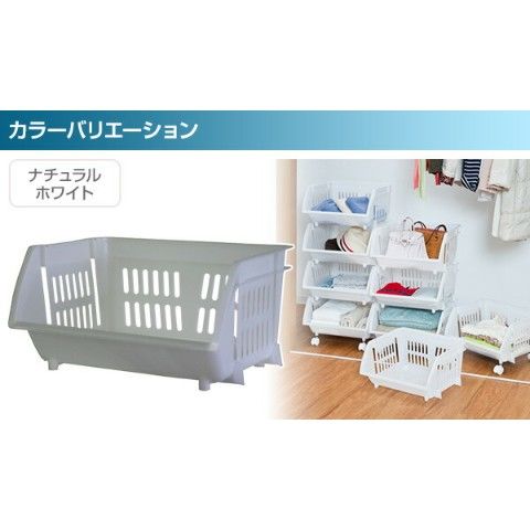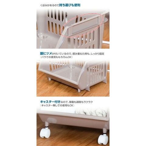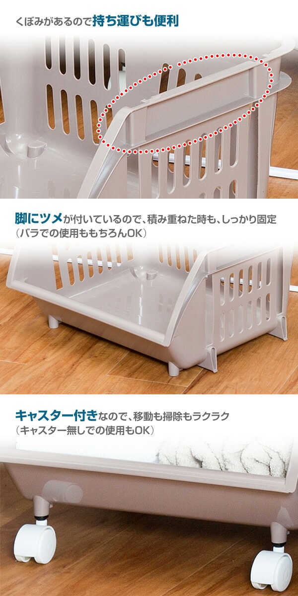 | 商品説明 | ●積み重ねバスケット ●バスケット4個セット(キャスター1組付き) ●間口が広く出し入れ簡単 ●本体はスリット入りなのでキッチンで野菜のストック、サニタリーではバスタオルや肌着などの収納に便利 ●キャスター付きで移動もラクラク ●4個での使用時の高さ89.5cm(キャスター装着時94.5cm) |