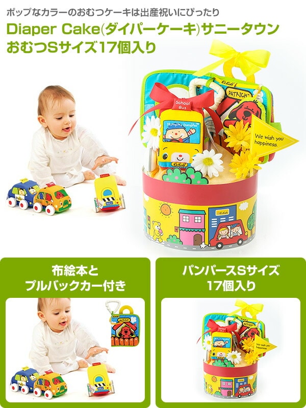 | 商品説明 | ●ポップなカラーのおむつケーキは出産祝いにぴったり ●布絵本とプルバックカー付き ●パンパースSサイズ17個入り |