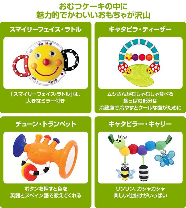 | 商品説明 | ●パンパースSサイズ25個入り ●おむつケーキの中に魅力的でかわいいおもちゃが沢山 ●「スマイリーフェイス・ラトル」は、大きなミラー付き ●ムシさんがむしゃむしゃ食べる葉っぱの部分は冷蔵庫で冷やすとクールな歯がために「キャタピラ・ティーザー」 ●ボタンを押すと色を英語とスペイン語で教えてくれる「チューン・トランペット」 ●リンリン、カシャカシャ楽しい仕掛けがいっぱいの「キャタピラー・キャリー」 |