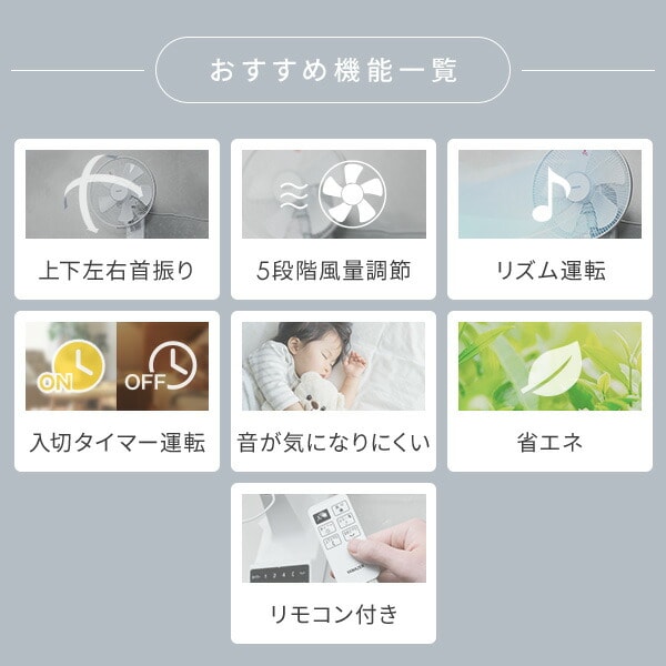 | 商品説明 | ●電源:AC100V(50/60Hz) ●消費電力:24W(50/60Hz) ●DCモーター搭載 ●羽根:直径30cm・5枚 ●入タイマー:1/2/4時間 ●切タイマー:1/2/4時間 ●切り忘れ防止:8時間自動オフタイマー ●風量切替:5段階 ●リズム風搭載 ●電源コード長さ:1.6m ●電気代目安(1時間あたり):約0.7円(50/60Hz) ●静音モード搭載 ●リモコン付き(フルリモコン) ●上下左右自動首振り ●上下手動角度調節:30度 ●メーカー保証:1年間 ※2024年12月より型番をYWRX-BGD305(W)→YWRX-BGD306(W)に変更しております。仕様の変更はございません |