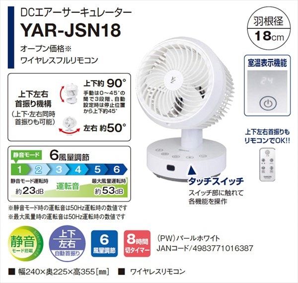 サーキュレーター 扇風機 18cm 上下左右自動首振り 風量6段階 リモコン 静音 26畳まで YAR-JSN18 空気循環 エアサーキュレーター エアーサーキュレーター 首振り 換気 熱中症対策 山善 YAMAZEN 【送料無料】