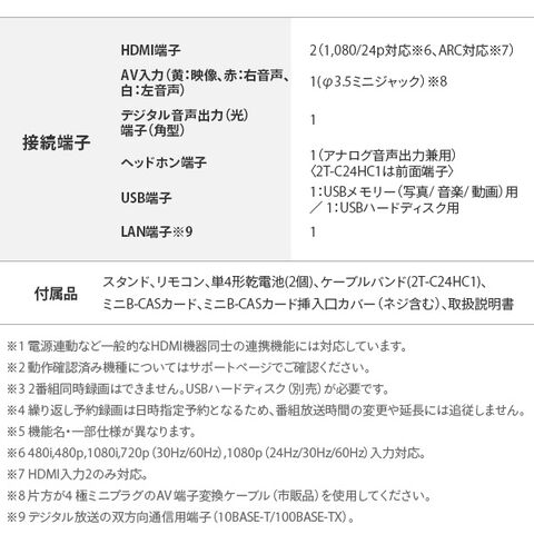 | 商品説明 | ●画面サイズ:32V型ワイド ●画素数:1366×768 ●消費電力:約43W ●待機時消費電力:0.5W ●年間消費電力量:41kWh/年 ●省エネ基準達成率:100% ●2チューナー:地上デジタル(CATVパススルー対応)、BS/110度CSデジタル ●外光や照明の映り込みを低減する高精細「低反射パネル」 ●HDMI端子:2(1080/24p対応、ARC対応) ●AV入力(黄:映像、赤:右音声、白:左音声):1(3.5mmミニジャック) ●デジタル音声出力(光)端子(角型):1 ●ヘッドホン端子:1(アナログ音声出力兼用) ●USB端子:1(USBメモリー:写真/音楽/動画用)、1(USBハードディスク用) ●LAN端子:1 ●AQUOSファミリンク対応 ※電源連動など一般的なHDMI機器同士の連携機能には対応しています ●USB外付けハードディスク(別売)対応 ●直下型LEDバックライト採用 ●付属品:スタンド、リモコン、単4形乾電池(2個)、ミニB-CASカード、ミニB-CASカード挿入口カバー(ネジ含む)、取扱説明書 ●メーカー保証1年付き ※こちらの商品は2025年10月より型番を2T-C32AC1→2T-C32HC1に変更しております |