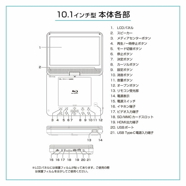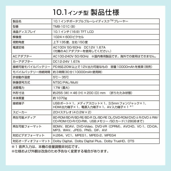 | 商品説明 | ●液晶ディスプレイ:10.1インチ(16:9)TFT、LCD ●解像度:1024×600ピクセル ●視野角度:上下135度、左右150度 ●電源:AC100V 50/6OHz DC12V 1.67A(付属のACアダブターを使用してください。) ●ACアダプター:AC 100-240V 50/60Hz※国内専用製品です。海外での使用はできません。 ●カーアダブター:DC12-24V 1.67A ●接続可能モバイルバッテリー:PD対応20W以上で12V出力可能なもの 容量10000mAhを推奨(別売) ●許容動作温度:5℃~35℃ ●映像信号方式:NTSC/PAL/自動 ●消費電力:17W(最大) ●モバイルバッテリー持続時間:約3時間30分(10000mAh 使用時) ●接続端子:USB ポート×1、メディアスロット×1、3.5mmフォンジャック×1、HDMI出力端子×1、電源入力端子×1、AV入力端子×1 ※音声入力は、本機の音量調節非対応です。 ●スピーカー:2CHステレオ(4Ω 2W×2) ●再生可能メディア:BD-ROM/BD-R/BD-RE/BD-R、DL/BD-RE、DL/DVD-ROM/DVD±R/DVD±RW/CD-ROM/CD-R/CD-RW、USB メモリー/SD カード(128GBまで) ●再生可能フォーマット:BDMV、BDAV、DVD-Video、DVD-VR(CPRM)、AVCHD、VC-1、CD-DA、MP3、WAV、JPEG、PNG、GIF、AVI ●対応ビデオフォーマット:H.264、VC1、MPEG1、MPEG-2、MPEG4 ●対応オーディオフォーマット:Dolby Digital、Dolby Digital Plus、Dolby TrueHD、DTS ●付属品:リモコン、リモコン用乾電池、PD対応 Type-C アダプター、Type-C ケーブル、シガー電源アダプター、AVケーブル、車載用ケース、取扱説明書兼保証書 ●メーカー保証:1年 ※2025年7月から一部仕様を変更しております ・型番:TMB-L90R1→TMB-101C ・画面サイズ:9インチ→10.1インチ ・消費電力:20W→17W ・3WAY電源:AC/DC/リチウムイオンバッテリー内蔵→AC/DC/モバイルバッテリー対応 |
