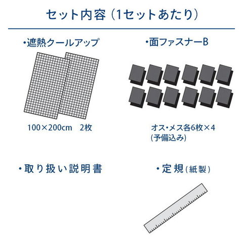 | 商品説明 | ●窓に貼ることで日差しと熱を徹底ガード! ●マジックテープで窓に貼るだけの簡単設置 ●室内温度の上昇を最大約11度抑えることが可能 ●ナノ粒子の特殊コーティングのため、繊維の目をつぶさず風通し良好 ●日中は外からの目隠し効果としても ●洗濯ネット使用で洗濯可能 ●対応ガラス:単層ガラス、複層ガラス、Low-Eガラス、網入りガラス、凹凸ガラス ●セット内容(1セットあたり):本体(100×200cm)×2枚、紙製定規、面ファスナーB×24枚、取り扱い説明書 ●2セットでのお届け |