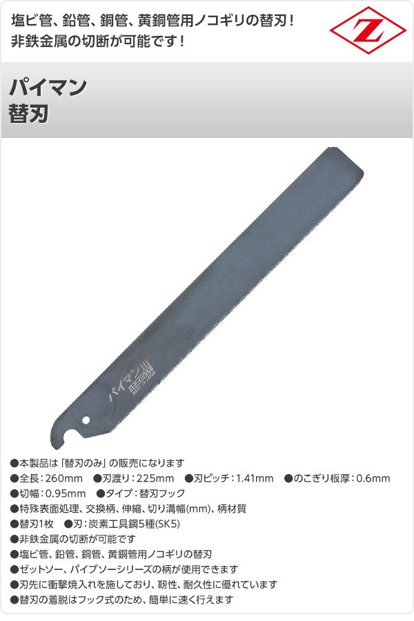 | 商品説明 | ●本製品は「替刃のみ」の販売になります ●全長:260mm●刃渡り:225mm ●刃ピッチ:1.41mm ●のこぎり板厚:0.6mm ●切幅:0.95mm ●タイプ:替刃フック ●特殊表面処理、交換柄、伸縮、切り溝幅(mm)、柄材質 ●替刃1枚 ●刃:炭素工具鋼5種(SK5) ●非鉄金属の切断が可能です ●塩ビ管、鉛管、銅管、黄銅管用ノコギリの替刃 ●ゼットソー、パイプソーシリーズの柄が使用できます ●刃先に衝撃焼入れを施しており、靭性、耐久性に優れています ●替刃の着脱はフック式のため、簡単に速く行えます |
