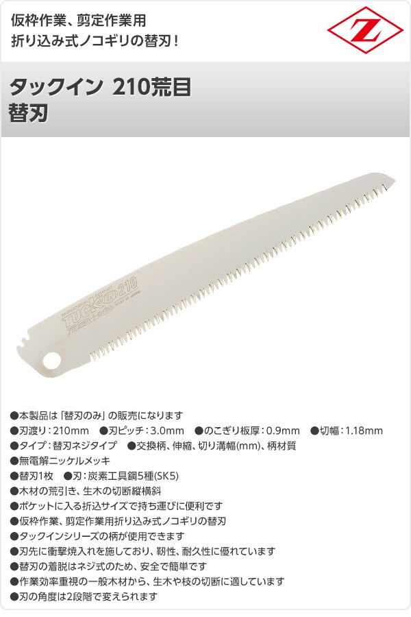 タックイン 210荒目 替刃 18201 仮枠作業 剪定作業用 折り込みノコギリ 折込鋸 一般木材 生木 枝 ゼット販売 【送料無料】