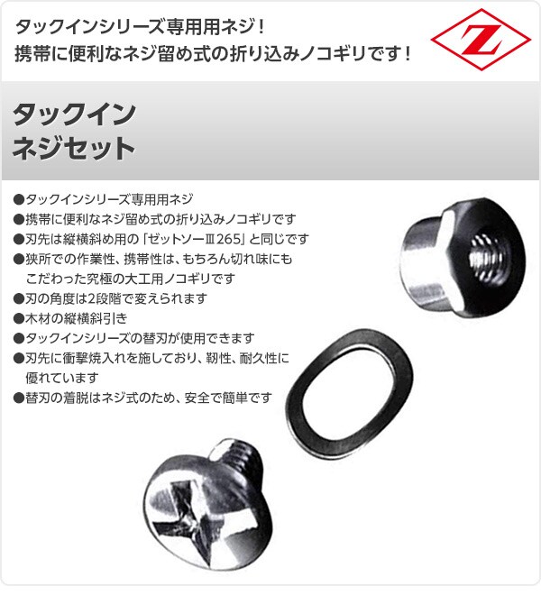 | 商品説明 | ●タックインシリーズ専用用ネジ ●携帯に便利なネジ留め式の折り込みノコギリです ●刃先は縦横斜め用の「ゼットソー265」と同じです ●狭所での作業性、携帯性は、もちろん切れ味にもこだわった究極の大工用ノコギリです ●刃の角度は2段階で変えられます ●木材の縦横斜引き ●タックインシリーズの替刃が使用できます ●刃先に衝撃焼入れを施しており、靭性、耐久性に優れています ●替刃の着脱はネジ式のため、安全で簡単です |