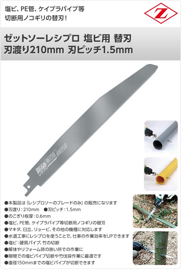 ゼットソーレシプロ 塩ビ用 替刃 刃渡り210mm 刃ピッチ1.5mm 20102 電動鋸刃 レシプロソー用 セーバーソー用 替刃 替え刃 竹 塩ビ プラ ゼット販売 【送料無料】