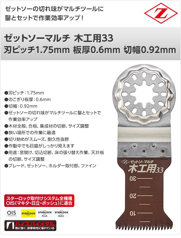 ゼットソーマルチ 木工用33 刃ピッチ1.75mm 板厚0.6mm 切幅0.92mm 20011 マルチツール 材木全般 合板 集成材 切断 サイズ調整 ゼット販売 【送料無料】