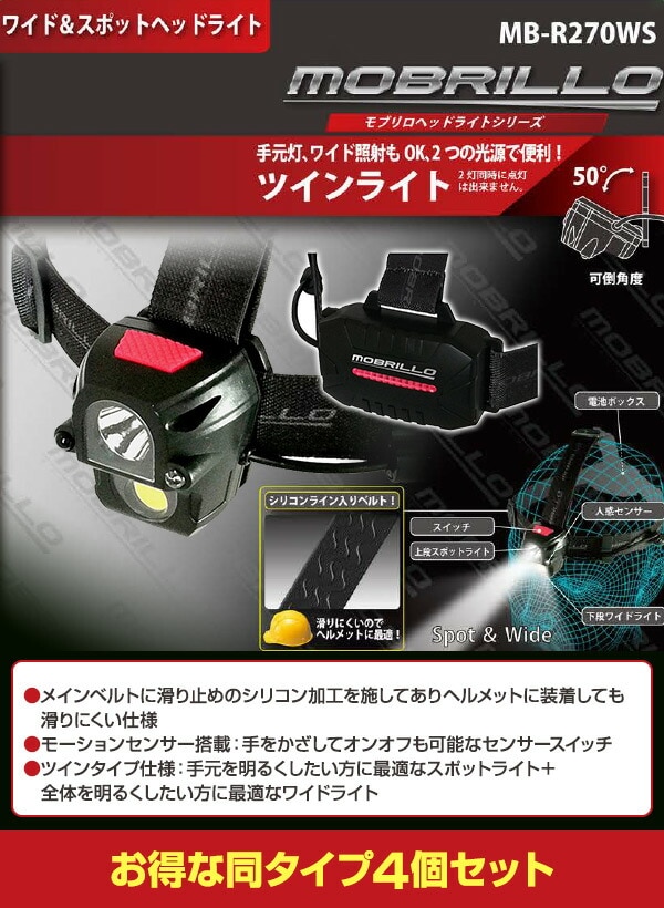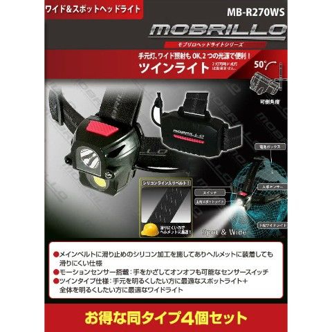 | モブリロ(MOBRILLO) ヘッドライト 充電式 防塵防水仕様 160ルーメン モーションセンサー付属 4個セット MB-R270WS*4 |