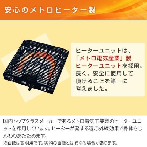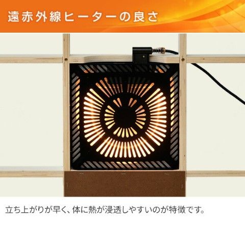 | 商品説明 | ●電源:AC100V(50Hz/60Hz) ●消費電力:600W ●ヒーター型番:MHU-601E ●電気代目安(1時間あたり):(強)約4.9円、(弱)約1.9円 ※電気料金目安単価 27円/kWhを基に算出 ●手元で温度が調節できるコントローラー付き ●電源コード長さ:3m ●手元コントローラーが収納できる隠し収納ボックス付き ●付属のハンドルを使ってテーブルの高さを調節できます(55.5-76.5cm) |
