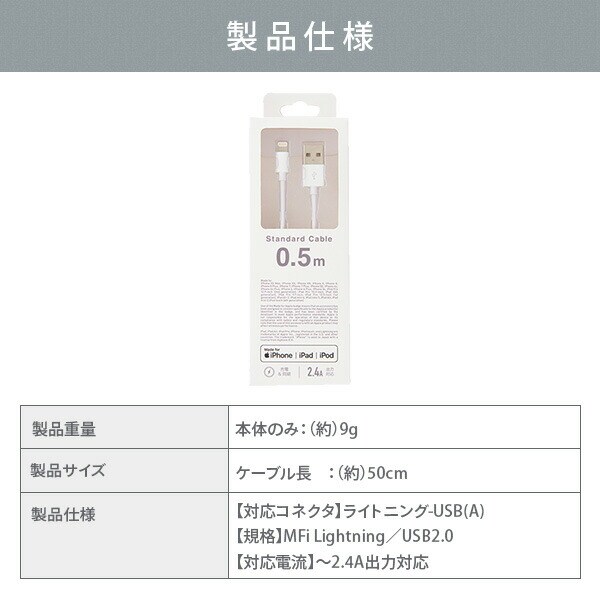 | 商品説明 | ●アップルライセンス認証品のUSBケーブル ●純正と同等のコネクタのコンパクトさがポイント ●ケーブル長50cmでPCでの使用やモバイルバッテリーなどでの使用に便利 |