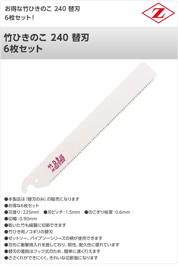 竹ひきのこ 240 替刃 6枚セット 8016*6 竹切断 解体 切断 のこぎり ノコギリ 鋸 切断工具 ゼット販売 【送料無料】