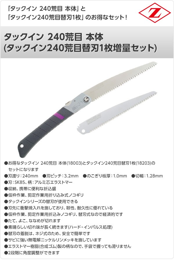 タックイン 240荒目 本体 (タックイン240荒目替刃1枚増量セット) 18003+18203 仮枠作業 剪定作業用 折り込みノコギリ 折込鋸 一般木材 生木 枝 ゼット販売 【送料無料】