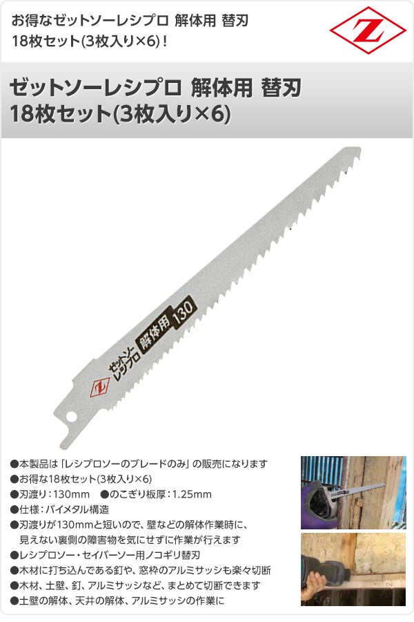 ゼットソーレシプロ 解体用 替刃 18枚セット(3枚入り×6) 20141*6 電動鋸刃 解体作業用 レシプロソー用 セーバーソー用 替刃 替え刃 ゼット販売 【送料無料】