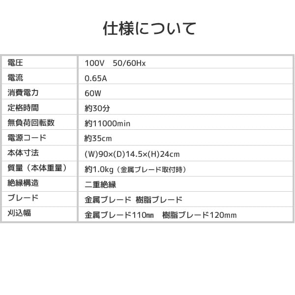 | 商品説明 | ●電源:AC100V50/60Hz ●定格消費電力:60W ●定格時間:30分 ●回転数:約11000rpm ●刈込幅:(金属ブレード)11cm、(樹脂ブレード)12cm ●付属品:金属ブレード×1、樹脂ブレード×11、10m延長コード×1 ●強靭な金属ブレードと軽快な樹脂ブレード、用途に合わせて2種類の刈刃を使い分けが可能 ●総重量1.0kgという超軽量タイプなので、女性の力でも簡単に作業ができる ●コンセントに差し込めば、すぐに使えるAC100V |