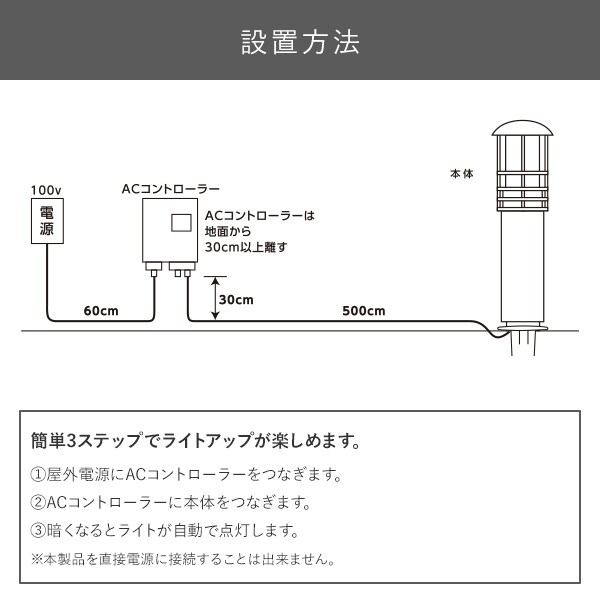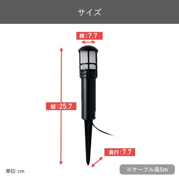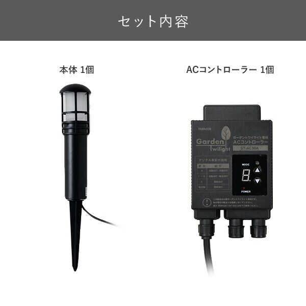 | 商品説明 | ●空間を照らすガーデンライトのスタートキット ●IP65の防塵防水性能なので雨天でも問題なく使用できます ●屋外用PSE認証を取得済みなのでお庭でも安全にお使い頂けます ●お庭の電源に接続するだけで誰でも簡単にライトアップが楽しめます ●ライトは耐久性の高いアルミ素材 ●LED寿命が50,000時間なので長期間交換が不要です ●電気代も1年で約670円しかかかりません ●ACコントローラーで夜間に自動ライトアップが可能 ●自動点灯や消灯、タイマー消灯等のパターン切り替えが可能です ●防塵防水性能:IP65 ●LEDタイプ:COB LED×1 ●光束:160lm±10%・3W±10%●光色:電球色(GD) ●LED寿命:50,000時間 ※1日11時間点灯で約12年間使用可能です LED電球を交換することはできません ●電気代1年間で約600円 ※1台追加毎に年間+約450円 ※1kwh=31円換算、1日当たり11時間点灯 ●コードの長さ:5m ●屋外用PSE認証取得済み ●ACコントローラー:最大出力36W ※消費電力最大24.5Wまで連結可能 ※最大8台まで連結可能 ※入力AC100、DC12V ※AC100V側のコード長:0.6m ※自動点灯、自動消灯、時間消灯、常時点灯、常時消灯を切替可能 ※防塵防水性能:IP67 ●セット内容:ガーデンライト本体×1、ACコントローラー×1 ●別売りの追加用ライト、コードで、ライトアップの幅が広がります ●3つのライトを設置したい場合:追加用ライト(ガーデントライライトシリーズ)×2、追加用分岐コード(GT-ZBC3)×1 |