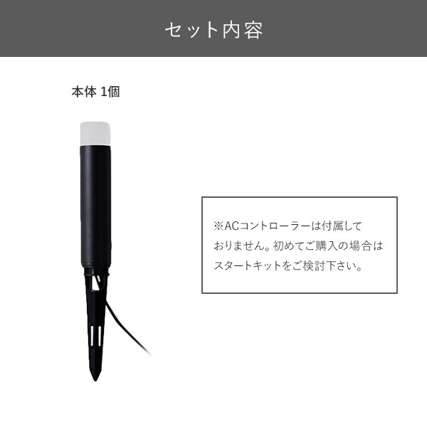 | 商品説明 | ●空間を照らすガーデンライトの追加用単品販売のページです ●プレートを使って壁や木、アンカーを使って土や芝生に設置可能です ●スタートキットに追加してライトアップの幅を広げましょう ●3つのライトを設置したい場合:スタートキット×1(ガーデントライライトシリーズ)、追加用ライト×2、追加用分岐コード(GT-ZBC3)×1●IP65の防塵防水性能なので雨天でも問題なく使用できます ●屋外用PSE認証を取得済みなのでお庭でも安全にお使い頂けます ●お庭の電源に接続するだけで誰でも簡単にライトアップが楽しめます ●ライトは耐久性の高いアルミ素材 ●LED寿命が50,000時間なので長期間交換が不要です ●電気代も1年で約670円しかかかりません ●ACコントローラーで夜間に自動ライトアップが可能 ●自動点灯や消灯、タイマー消灯等のパターン切り替えが可能です ●防塵防水性能:IP65 ●LEDタイプ:COB LED×1 ●光束:160lm±10%・3W±10%●光色:電球色(GD) ●LED寿命:50,000時間 ※1日11時間点灯で約12年間使用可能です LED電球を交換することはできません ●電気代1年間で約670円 ※1台追加毎に年間+約450円 ※1kwh=31円換算、1日当たり11時間点灯灯 ●コードの長さ:5m ●ライト角度:180度調整可能 ●屋外用PSE認証取得済み●セット内容:ガーデンライト本体×1のみ |