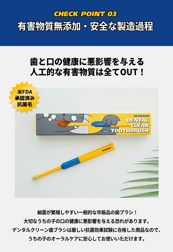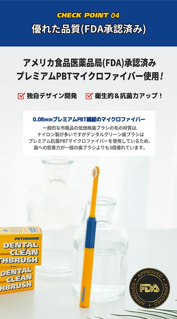 | 商品説明 | ●アメリカ食品医薬品局で認証されたプレミアム抗菌PBTマイクロファイバー毛を使用 ●0.08mmのソフトなマイクロファイバー毛で歯茎へに刺激を最小限に抑え歯間の汚れを管理 ●幅5mmの超小型歯ブラシヘッドで口が小さい犬&猫の奥歯までしっかりケア ●手首に無理がかからない超軽量の8g ●完成度の高い六角形のデザインを適用させ、人体工学的設計はもちろん中央部分の滑り止め機能により手にかかる負担を抑え、安定的なグリップ感をお届けします ●11種類の有害物質無添加のため、より安心してお使いいただけます。 (アンチモン、ヒ素、バリウム、カドミウム、鉛、水銀、クロミウム、セレニウム、ビスフェノールA、PBBs、PBDES) ●犬・猫兼用 |