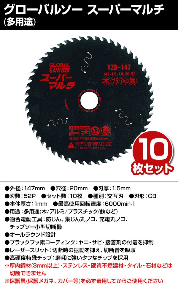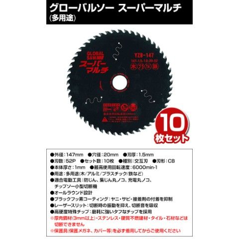 グローバルソー スーパーマルチ (多用途) 10枚入り 外径147×内径20×刃厚1.5mm YZB-147*10 チップソー 切断 替刃 電動工具用 GLOBAL SAW モトユキ 【送料無料】