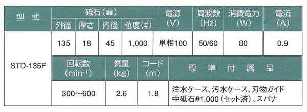 | 商品説明 | ●コード長:約1.8m ●電源:AC100V ●周波数:50/60Hz ●消費電力:40W(最大) ●無負荷回転数:変速300から600min-1 ●定格:30分 ●砥石寸法:外径135×内径45×厚さ18mm ●付属品:中砥石(#1000)、砥石押さえ、スパナ、排水受ケース(以上本体に装着済)、給水タンク ●絶縁方式:2重絶縁 ●小型軽量で持ち運びに便利 ●刃物に合わせて回転数調節可能 ●砥ぎ水は本体内部の容器に溜める構造 ●メーカー保証半年付き |