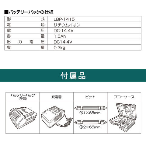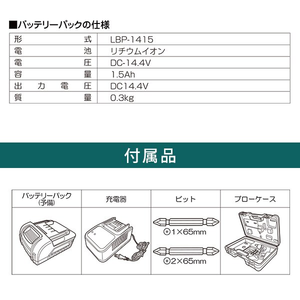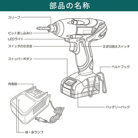 | 商品説明 | ●付属品:バッテリー2個、充電器、ビット2本、ブローケース ●最大トルク130N・mのインパクトドライバー ●LEDライト付き ●無段変速/ブレーキ付き ●充電時間約30分 ●ブローケース入り |