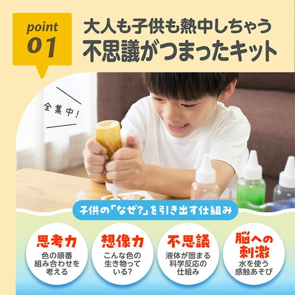 | 材質 | カラーインク:水・ヒドロキシプロピルメチルセルロース・アルギン酸ナトリウム 凝固パウダー:塩化カルシウム 型(海のなかまたち):ABS樹脂 ミニ水槽:PET |
