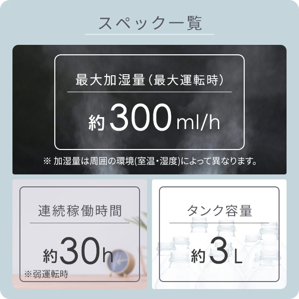 | 商品説明 | ●電源:AC100V (50/60Hz) ●消費電力:27W ●最大加湿量:300ml/h ●連続使用時間:約10時間(最大運転時) ●適用床面積の目安:木造約5畳まで・プレハブ約8畳まで ●水タンク容量:約3L ●コード長さ:約1.5m ●切タイマー:1/2/4時間 ●AG銀抗菌カートリッジ付き ●メーカー保証:1年間 ※2023年7月より型番をMZ-L30→MZ-L301に変更しております。仕様に変更はございません。 |