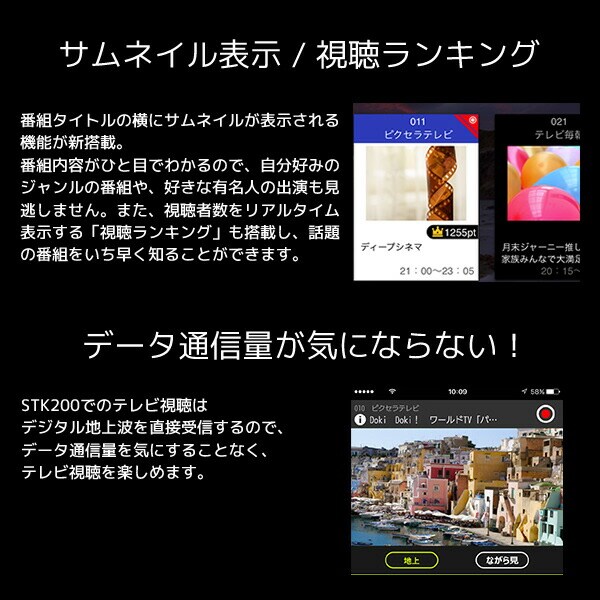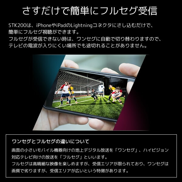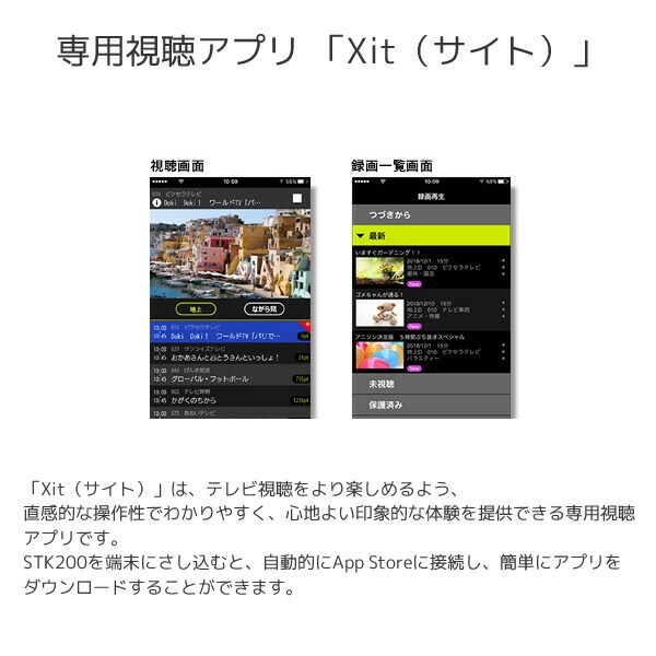 | 商品説明 | ●消費電力:230mW ●アンテナ:ロッドアンテナ ●使用温度範囲:5-35?C ●インターフェース:Lightningコネクタ※iPhone・iPadを充電する機能はありません ●受信放送:地上デジタルテレビ放送(ISDB-T)UHF 13ch-52ch ●対応OS:iOS 10/11/12 ●Xit Stick(STK200)をLightningコネクタに接続するだけでiPhone/iPadがテレビに早変わり ●コンパクトでスティックへの充電は不要 ●ワンタップで簡単に番組を録画 ※録画機能のご利用は視聴中の番組に限られます。録画予約およびバックグラウンドでの録画はできません。 ●iPhone/iPadにケースやカバーを装着している場合、形状によっては、はずさないと使用できない場合があります。 ●同梱内容:本体、取扱説明書兼保証書 ●メーカー保証:1年 |