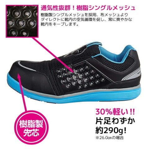 | 商品説明 | ●サイズは8サイズ(24.5cm、25.0cm、25.5cm、26.0cm、26.5cm、27.0cm、27.5cm、28.0cm)よりお選びください ●カラーは3色(10:レッド/ブラック、53:ライム/グレー、70:ブルー/ブラック)よりお選びください ●用途:普通作業 ●足囲:4E ●重量:片足290g(26cm代表値) ※重量は同サイズでも製品によって多少のバラツキがありますので予めご了承ください ●超軽量タイプ ●JSAA A種認定品 ●プロテクティブスニーカー型式認定合格品 ●新開発の特殊樹脂製先芯を採用し、安全性能を損なうことなく軽量化を図りました ●肉厚のEVAミッドソールが優れたクッション性を発揮し、踵部や膝への負担軽減を図りました ●樹脂製のシングルメッシュを採用、布メッシュよりダイレクトに靴内の空気循環を促し、常に爽やかな靴内をキープします ●油の付着した床面でも変質しにくく、安心して使える耐油底を採用しました ※油床面での防滑性能を保障するものではありません ●脱ぎ履きが簡単なスリッポンタイプ |