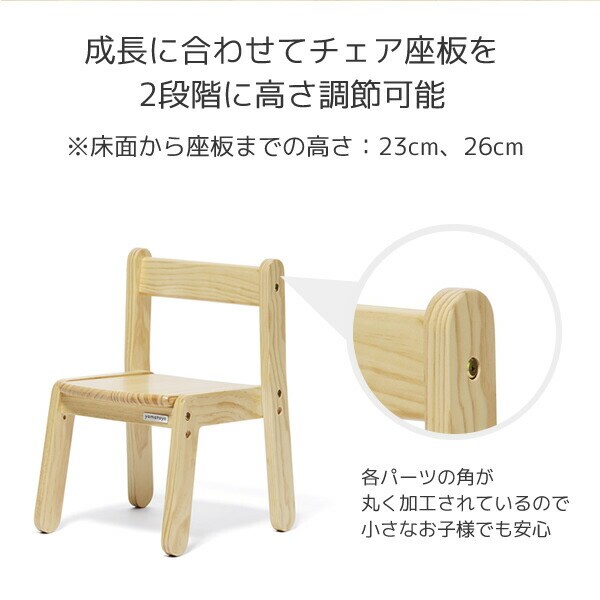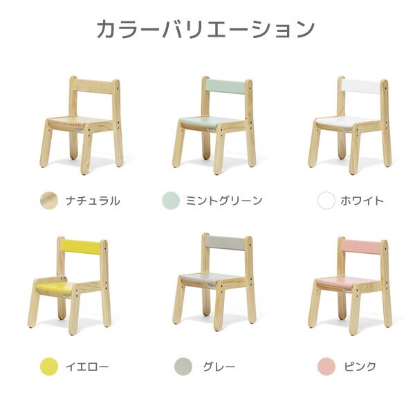 | 商品説明 | ●美しい木目をもつパイン材を使用した天然木の家具 ●成長に合わせてチェア座板を2段階に高さ調節可能 ※床面から座板までの高さ:23cm/26cm ●3脚まで積み重ねが可能 ●小さなお子様でも自分で持って運べる重さ ●6色展開でお部屋の雰囲気やお子様の好みでお選びいただけます ●各パーツの角が丸く加工されているので小さなお子様でも安心 ●耐荷重:座板30kg ●対象年齢:18か月から6歳頃 ※天然木につき、1点1点木目や風合いは異なります ※こちらのページは「リトルチェア」のみの販売です |