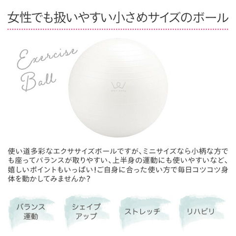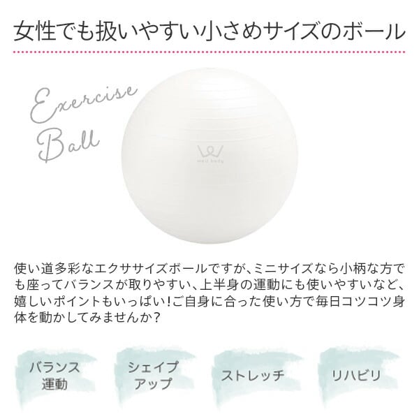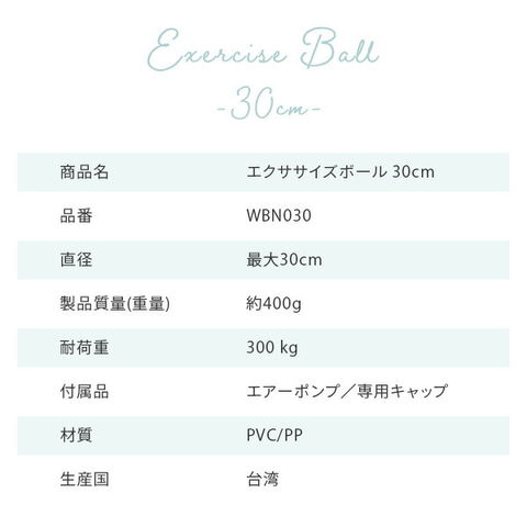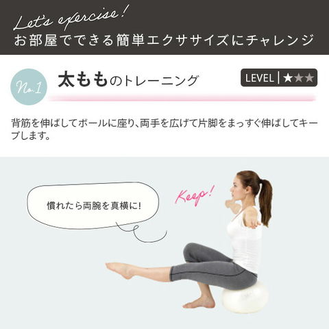 | 商品説明 | ●直径30cmの小さめサイズで収納しやすい ●ボールに乗るだけで自宅で手軽に簡単エクササイズ ●空気を入れるエアーポンプ付 ●運動マニュアル付 ●破裂しにくいノンバースト仕様 ●耐荷重300kgの安心設計 |