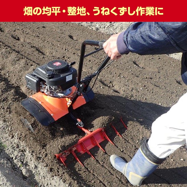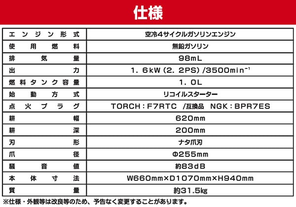 | 商品説明 | ●エンジン:空冷4サイクルガソリンエンジン ●排気量:98ml ●出力:1.6kW(2.2PS)/3500min-1 ●使用燃料:無鉛ガソリン ●燃料タンク容量:1.0L ●オイル量:0.3L ●点火プラグ:TORCH:F7RTC / 互換品 NGK:BPR7ES ●始動方式:リコイルスターター式 ●耕幅:620mm ●耕深:200mm ●爪径:直径255mm ●刃形:ナタ爪刃 ●耕刃回転数:140min-1 ●騒音値:約83dB ●ハンドル部分は折りたたみができて収納、持ち運びに便利 ●折りたたみ時サイズ:幅66×奥行66×高さ90cm ●タイヤ付きで移動が簡単 ●ワイドな耕幅で効率よく耕せます ●直進性を安定させるサイドディスク付き ●手元スイッチで安心、簡単操作 ●付属品:スパナ(10/12mm)×1、スパナ(13/16mm)×1、プラグレンチ×1、結束バンド×4 ※2022年3月より、抵抗棒の形状・移動用車輪の色・全体重量が変更となりました。 |