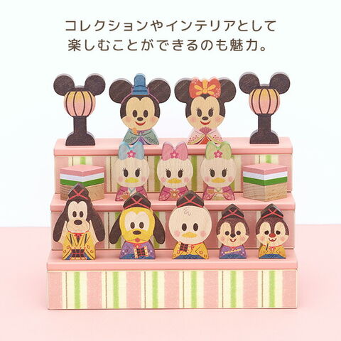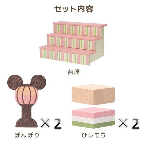 | 本体サイズ | パッケージサイズ:幅32×奥行5×高さ25cm 台座(組立後):幅23×奥行16×高さ13.5cm ミッキー:幅6×奥行1.5×高さ6.8cm ミニー:幅6×奥行1.5×高さ6.5cm エイプリル:幅3.5×奥行1.5×高さ5.5cm メイ:幅3.5×奥行1.5×高さ5.5cm ジューン:幅3.5×奥行1.5×高さ5.5cm グーフィー:幅4.8×奥行1.5×高さ7cm プルート:幅5×奥行1.5×高さ6.1cm ドナルド:幅3.9×奥行1.5×高さ6.2cm チップ:幅3×奥行1.5×高さ4.9cm デール:幅3×奥行1.5高さ4.9cm ぼんぼり:幅5×奥行1.5×高さ6.9cm 菱餅:幅3×奥行1.5×高さ3cm 無垢BLOCK:幅3×奥行1.5×高さ3cm |