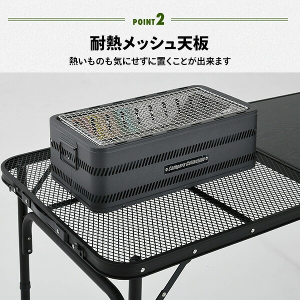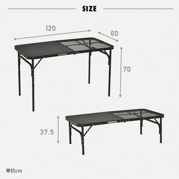 | 商品説明 | ●メッシュとフラット天板のハイブリッドタイプ ●メッシュ部分は耐熱、フラット天板は防滴仕様 ●継脚で高さ2段階調整可能 (37.5cm/70cm) ●天板総耐荷重40kg ●収納サイズ:幅60×高さ60cm ※この商品は、2024年12月25日より型番が変更になっております 【型番】HMT-1260→HMT-1260R ・天板の柄と材質が若干変更になりました。 |