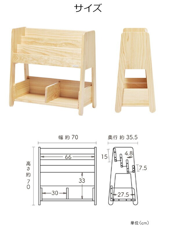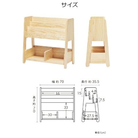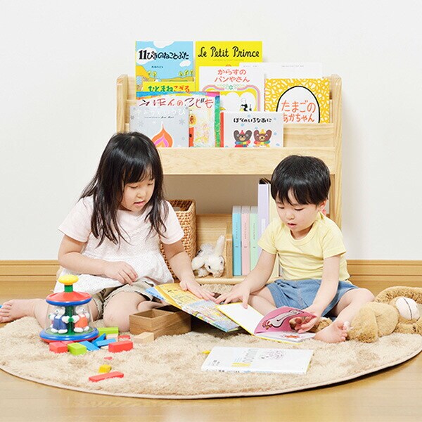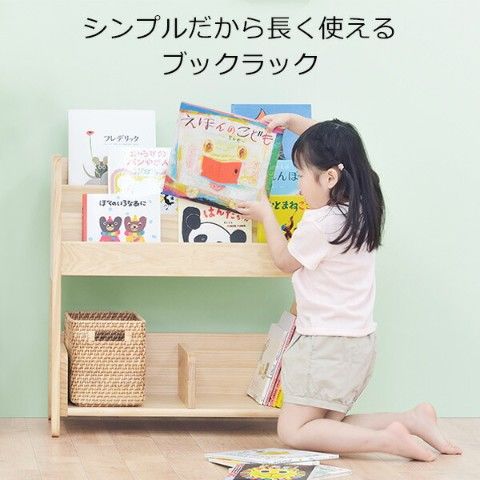 | 商品説明 | ●耐荷重:(上段)各段10kg、(下棚)30kg ●組立不要 ●子どもが自分で取り出したり、お片づけがしやすいブックシェルフ ●上部は表紙が見える向きで3段に分けて収納が可能 ●下部には本だけではなくおもちゃなども置け、収納力もたっぷり ●お子さまでも手の届くサイズ性と、収納力が魅力 |