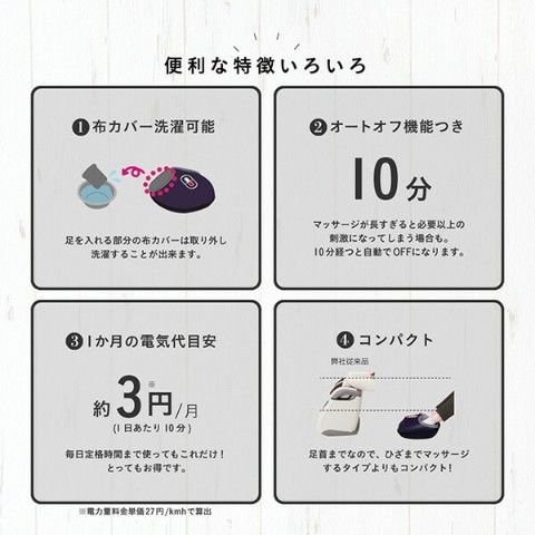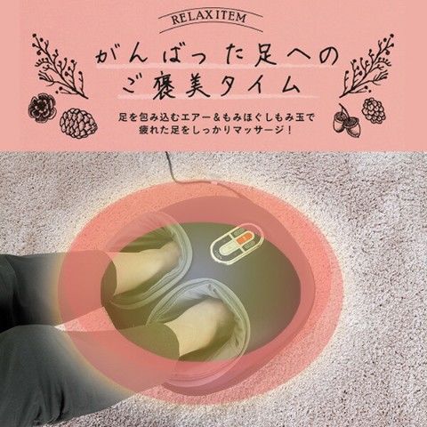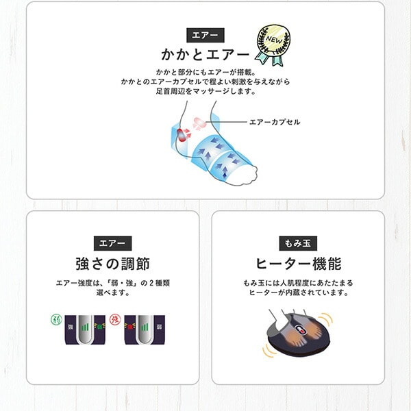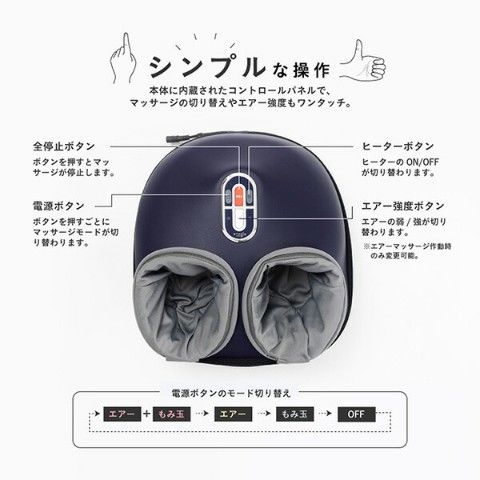 | 商品説明 | ●医療機器認証番号:301AGBZX00041000 ●定格電圧:AC100V 50/60Hz ●消費電力:22.5W(電熱部7W) ●定格時間:10分 ●1ヶ月の電気代の目安:約3円/月(1日あたり10分) ※電力量料金単価27円/kmhで算出 ●エアー強度2段階 ●ヒーター機能内蔵 ●モード切替: エアー+もみ玉マッサージ エアーマッサージ もみ玉マッサージ ●洗える交換カバー |