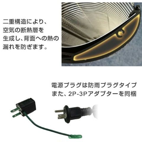 ●アルミニウム二重構造と調整された内部反射板で後ろには熱が漏れずに前面へ効率的に熱を放射